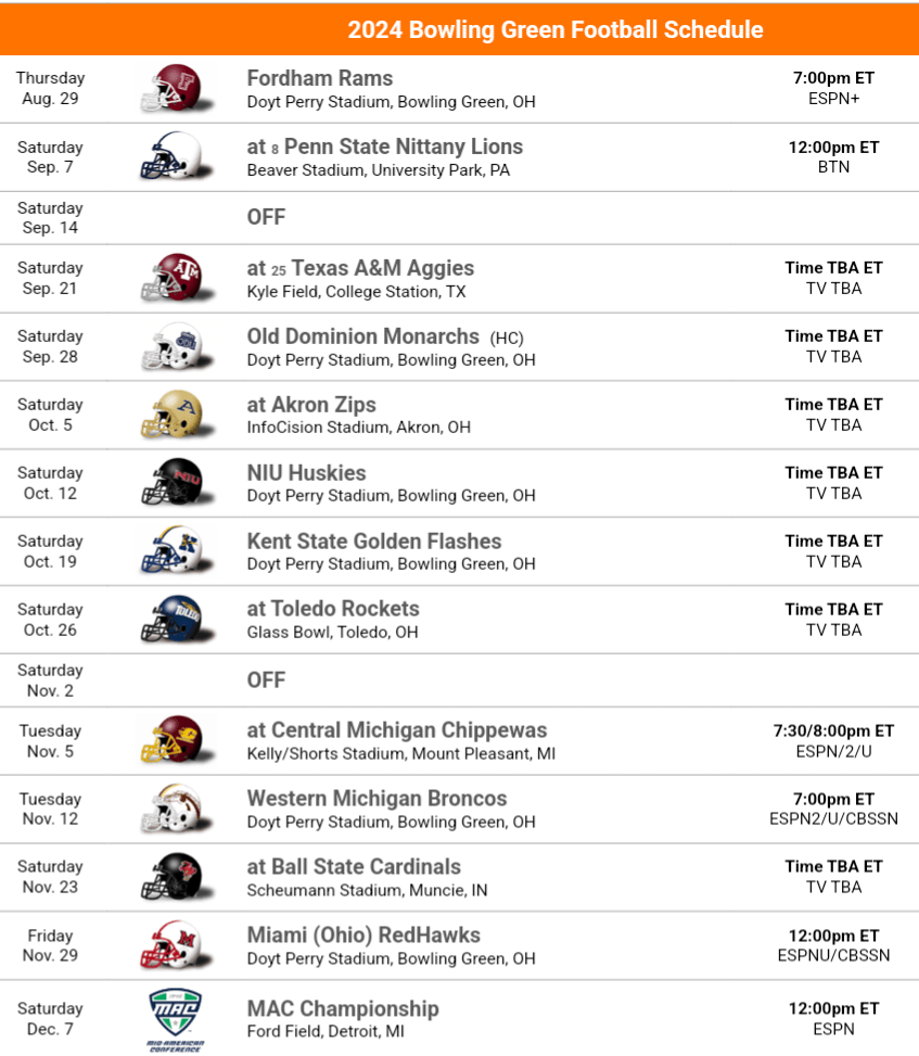 Head Coach: Bowling Green’s Head Coach is Scot Loeffler. He is entering his 6th year with the program and has a 20-35 record. His record is weighed down because it took a few years to rebuild, but 2023 was his first winning record. He’s brought some notable upsets along the way, twice they’ve won as 30 or more point underdogs, a 20-7 over Toledo in 2019 and a 14-10 win over Minnesota in 2021. There was also the surprise 38-27 win over Georgia Tech last year.