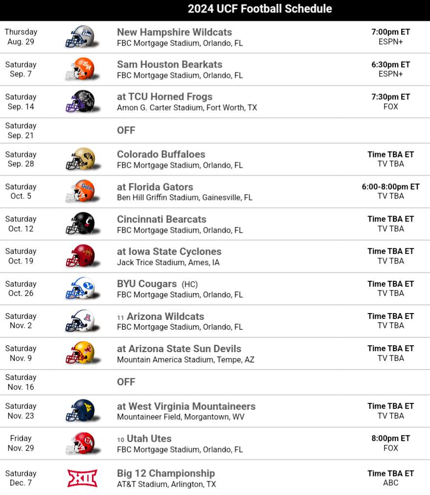2024 Schedule Thoughts: UCF’s non-conference isn’t bad, New Hampshire is a decent FCS foe and Sam Houston could be improved but UCF’s speed typically keeps them safe from an upset against teams like those, the game Knights fans have had circled for years is the trip to Gainesville to take on the Gators, that will be huge for in-state bragging rights. The Big 12 schedule isn’t bad, the Knights avoid the Kansas schools along with Oklahoma State so that’s 3 top contenders off the schedule and they get Utah/Arizona which are teams that aren’t used to the humidity at home. It’s definitely not a schedule that prohibits the Knights from conference championship contention.