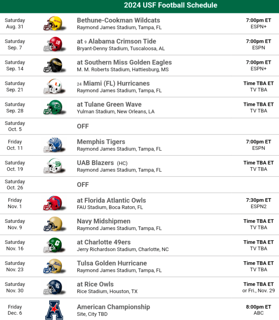 2024 Schedule Thoughts: The early portion of this schedule is rough. The Bulls get Alabama, Miami FL, and 2 of the best teams in the AAC all right off the bat. That game at Southern Miss could be tough as well. Following the Memphis game is where the schedule mostly eases up and can potentially allow the Bulls to keep their momentum if they pull off some good early wins, or find some if they don’t.