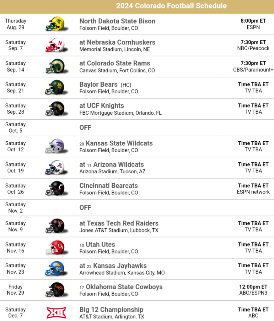 2024 Schedule Thoughts: This schedule is no joke. Colorado plays two classic rivalry games against Nebraska and Colorado State, both of whom are expected to be much improved this year. To wrap up the non-conference slate is a FCS foe, but not just any FCS foe. North Dakota State, arguably the most dominant program in FCS of the last 2 decades, prior to a tight loss to Arizona in 2022, North Dakota State was riding a 6 game win streak against FBS opponents, so yes this is a scary game! It doesn’t get any easier in conference play either. Colorado plays 7 of the top 8 favorites to win the conference!