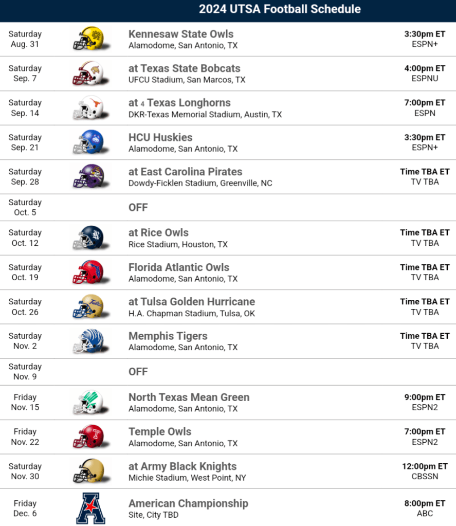 2024 Schedule Thoughts: First of all, I’m very excited that UTSA managed to be the only program to play all 4 Owls teams this year. The Roadrunners will look to claim superiority over all of the Owls. The non-conference schedule includes some tough tests against Texas State and Texas. It’s an incredibly favorable conference slate as the Roadrunners avoid Tulane and South Florida, plus get Memphis at home. Rice and Army on the road will be potential roadblocks to winning the conference.