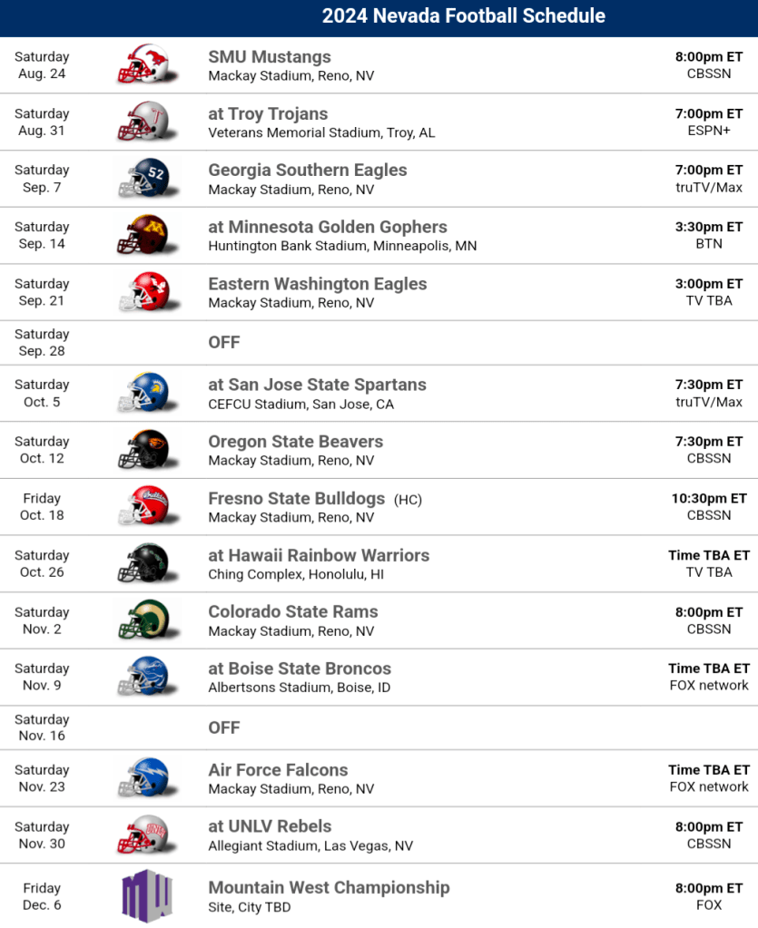2024 Schedule Thoughts: I don’t want to criticize Nevada too much because it’s a good thing to challenge yourself and schedules are made damn near a decade in advance these days so you never know what you’ll get, but wow this schedule is doing them no favors. Nevada took on a 13th game, they were eligible to do so thanks to the Hawaii exception, but this non-conference is brutal. I’d be surprised if any of their 4 FBS opponents didn’t make a bowl this year, and Nevada continues to set themselves up for abuse with their FCS opponent. Two years ago they played a tough foe in Incarnate Word and lost in a shootout, then played an even tougher Idaho team last year and got blown out. Eastern Washington had a disappointing season last year but with an experienced team back Nevada will have their hands full once again. Honestly the conference schedule isn’t much better, Nevada has to face basically every conference title contender. I also enjoy the fact that CBSSN has already claimed Jay Norvell’s 2nd return to Reno in primetime on November 2nd.