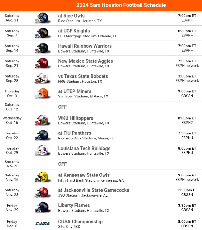 2024 Schedule Thoughts: Sam Houston’s non-conference is pretty tough. 3 of the 4 opponents made a bowl last year and all of them return a lot of key contributors, they might not be favored in any of these games. Conference play gets better though, they avoid a lot of the toughest teams in the conference until late in the year, plus get Liberty and WKU at home.
