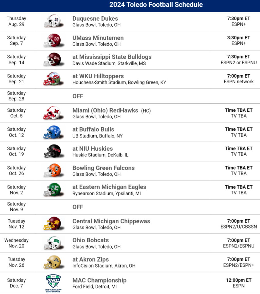 2024 Schedule Thoughts: This schedule is pretty balanced. Toledo gets a bit of an easier opening but then things get real in a hurry with Mississippi State, Western Kentucky and Miami in a 3 game stretch. We will know a lot about the Rockets and where they are after that stretch. Mississippi State is under a complete reset but the “SEC” jersey patch would make a victory there really resonate for the Rockets and put them in contention for the 5th auto bid for the playoff. The MAC schedule overall is tricky, you could argue Toledo plays all 5 of their biggest competitors for the conference title.