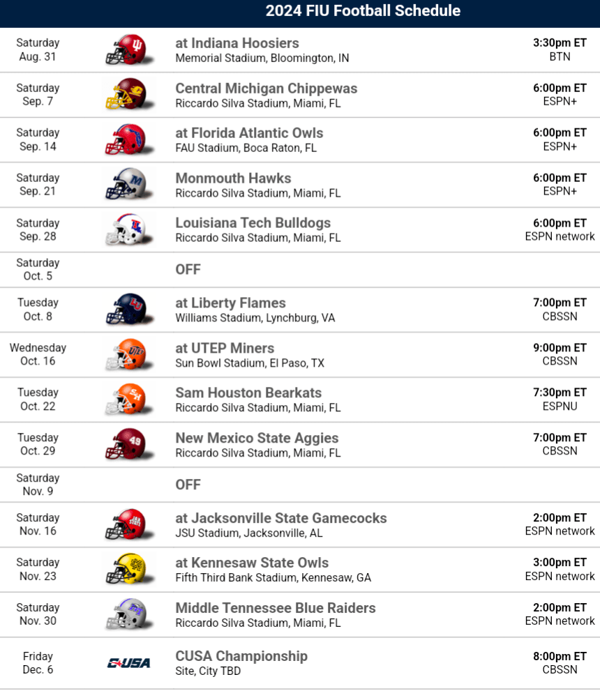 2024 Schedule Thoughts: There’s no easy games for FIU but with some improvement the Golden Panthers have a window to go bowling. The non-conference schedule includes Indiana who is under new leadership, the Shula Bowl against what could be an improved FAU and a home game against a Central Michigan team that could be up in the air. Their FCS foe is the Monmouth Hawks, fun fact about them, they’ve only had one head coach in their program’s history! Kevin Callahan is in his 32nd year! FIU avoids Western Kentucky in conference play which is very helpful.