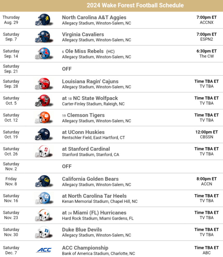 2024 Schedule Thoughts: This isn’t the worst ACC schedule, but it’s pretty challenging. That early conference game against Virginia is really going to set the tone for the season, Wake might be looking at another season without a bowl if they don’t win that one. The home game against Ole Miss on The CW is extremely random but difficult and heads a rough stretch, the Louisiana game could be a challenge especially with NC State/Clemson right after. The next stretch is a potential get right spot before a challenging last stretch against some in-state rivals and Miami FL.