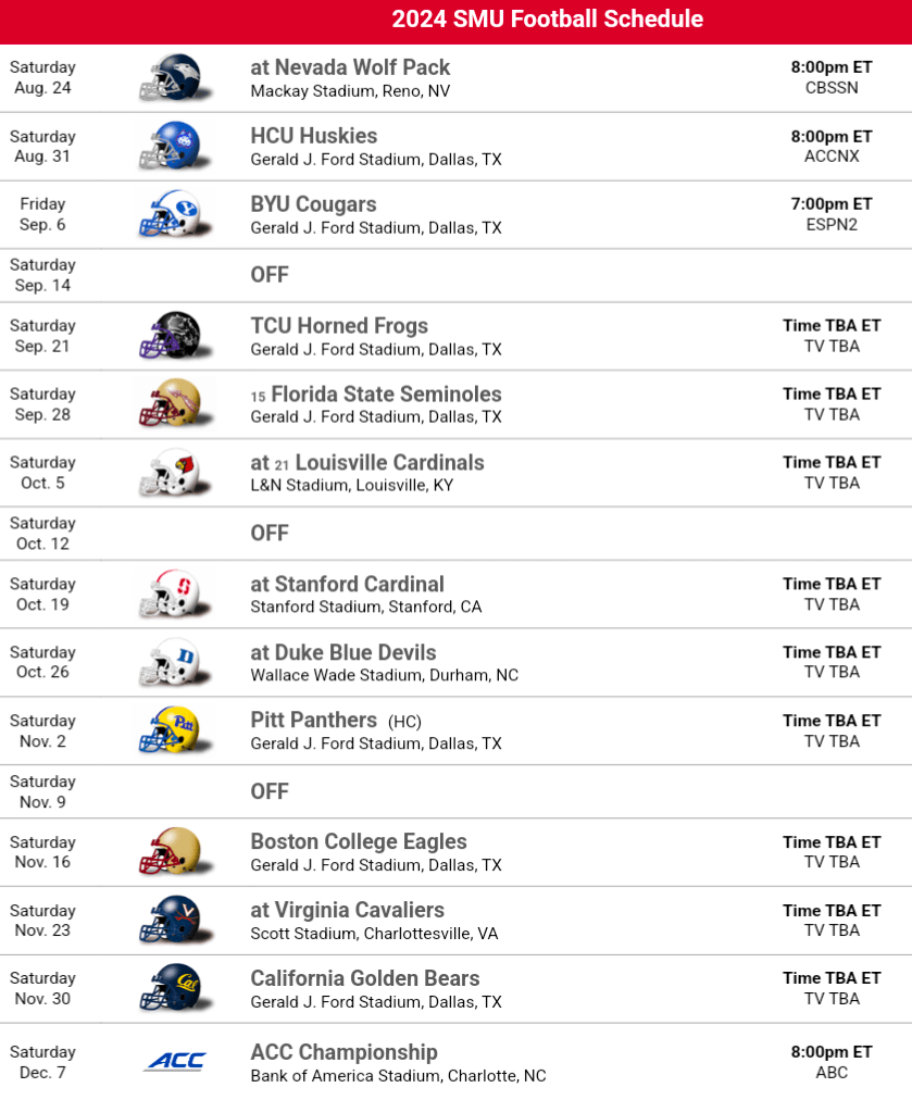 2024 Schedule Thoughts: SMU wasn’t afraid to challenge themselves with a game against BYU to go along with their previously annual rivalry with TCU. The ACC schedule is front loaded with challenges against Louisville and Florida State off the bat but it becomes pretty favorable after that as the Mustangs play a lot of teams who are expected to finish toward the bottom of the conference. Definitely not the worst slate for their first year in the conference.