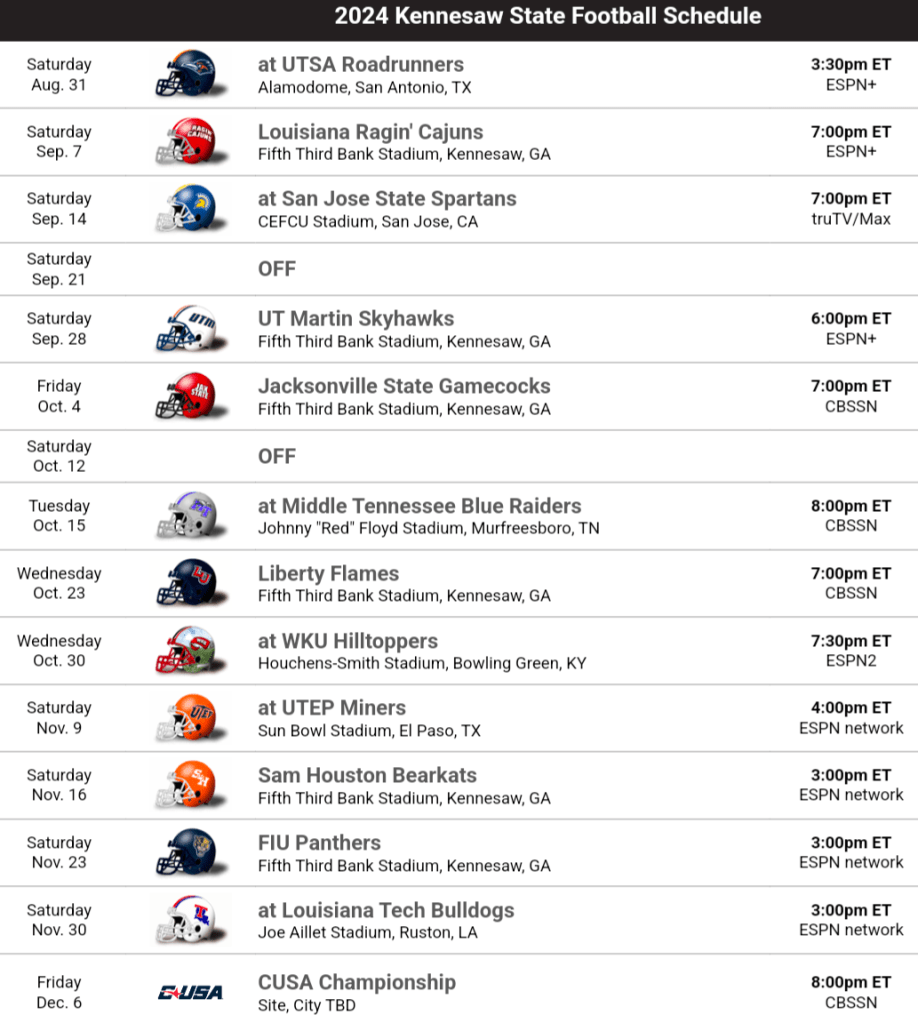 How does the 2024 Roster look?: This is the most challenging roster to figure out in the sport. If you looked at last season with a narrow lense you would instantly think this is the worst team in FBS, but context needs to be added. Kennesaw State aggressively punted on last season, shortened independent schedule and redshirted all players they felt would be key for this year. One finding was that Kennesaw State will have a pretty deep defense. They seldom gave up more than 24 points last year and they have a fun group of linebackers plus what is expected to be a good secondary. There’s some veteran experience up front too. They run a very fun pistol option offense that will be a challenge to defend when it works well. QB is a tough question, Davis Bryson is expected to be the starter, he is an electric runner but only completed 2 of 11 passes in his limited action last year. They have some weapons in RB Michael Benefield who played his games late last season and played well, Gabriel Benyard is an all utility player he’s considered a RB but he made his biggest impact through the air last year. The offensive line will mesh some experience with transfers. The Owls will be dangerous on the ground but how good the offense is will be determined by what they can get out of the passing game.
