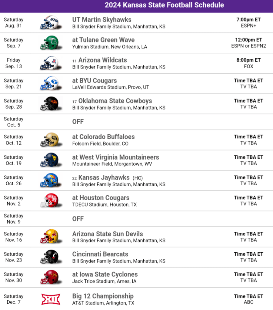 2024 Schedule Thoughts: This schedule is actually more difficult than you would think. Their non-conference features Tulane on the road, the Green Wave aren’t going to miss a beat compared to recent years and the weird “non-conference” conference game against Arizona who’s expected to be very good. There’s also UT Martin who’s a potential FCS playoff contender but Kansas State likely will overwhelm them. Looking at this conference schedule, there’s a lot of potential for this to go bad quickly. If there’s an issue for Klieman’s Kansas State teams, it’s slow starts and they really can’t afford to start slow here. They open conference play at BYU, the Cougars are a completely different team at home compared to on the road, then hosting Oklahoma State, and more road games after that. Kansas State can enter the Sunflower Showdown a Playoff contender or completely out of the playoff race. The ending stretch after Kansas is much easier until they finish the season with Farmageddon which could be a key game in the Big 12 race.