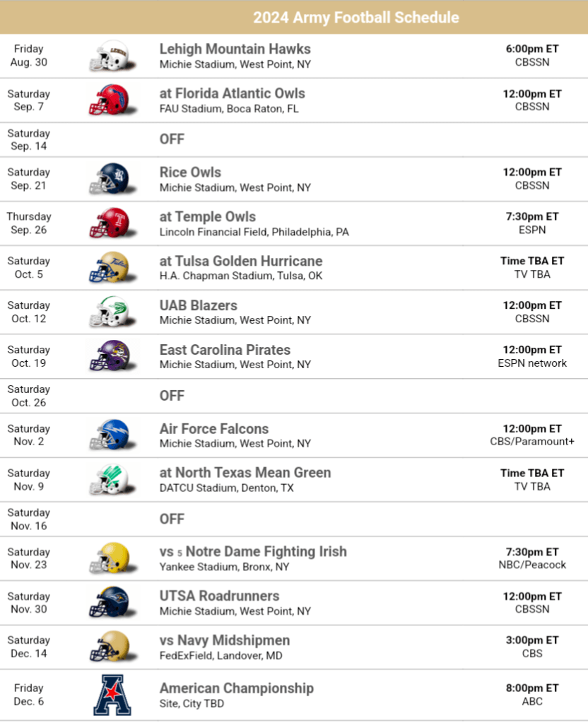 2024 Schedule Thoughts: Now that Army is in a conference, their non-conference schedule is mostly spoken for these days. They play Air Force, despite Navy being in the same conference they are still playing each other as a non-conference game during their traditional week and Army typically plays against a team from the Patriot League (where they have their other sports.) That leaves Army with 1 non-conference space each year and this year’s is filled with a cool matchup against Notre Dame under the lights. Army’s conference schedule is incredibly favorable. There’s 4 main favorites to win the conference and Army only plays 1 of them, UTSA at home. My favorite quirk is that Army is welcomed into The American by playing all 3 Owls teams in a row. With this schedule, Army is a greater threat to make the AAC title than most would expect.