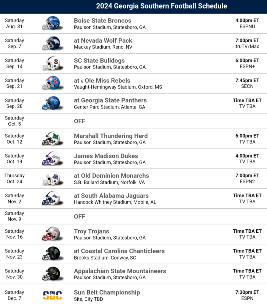 2024 Schedule Thoughts: This schedule is pretty rough. The Eagles open the season against a Boise State team that has a lot of hype, it does get easier with games against Nevada who is rebuilding and South Carolina State who is also starting over after the retirement of the legendary Buddy Pough. A loaded Ole Miss team wraps up the non-conference slate. The Sun Belt schedule is always going to be tough because the Eagles are in the loaded East division, and the draw of Troy/South Alabama from the west isn’t the easiest draw either.