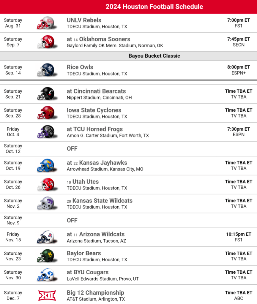 2024 Schedule Thoughts: So about the schedule… yikes. Houston’s non-conference is tough with Oklahoma, a UNLV team that’s a potential MWC title contender and a Rice team that beat them in a wild game last season plus returns a ton of experience. The conference schedule only makes matters worse, Houston has to play 5 of the top 8 contenders for the conference title and a lot of the games against teams in the same area of the preseason conference poll as them are on the road. I will say, while it makes no sense, Cougars vs Cougars on rivalry week is a fun title at least.