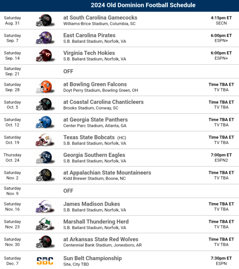 2024 Schedule Thoughts: This schedule is very tough. There’s no truly easy non-conference game. The Monarchs face South Carolina and Virginia Tech, fortunately the latter is at home but that’s also the more dangerous team. East Carolina struggled last season but is an offense away from being much more dangerous. Bowling Green had a winning record last season, could be more dangerous this season and is on the road. The conference schedule isn’t much better the Monarchs are in the loaded Sun Belt east division and get possibly the worst draw possible from the west with Texas State and Arkansas State who are both expected to be top contenders for that division. It’s actually impressive how disadvantageous this schedule is, their “easiest” stretch is actually 3 straight road games, their home game against Georgia Southern is on 5 days rest. Looking at this schedule I realize there’s a good chance that Old Dominion is a chaos team, it might be too much for them to be contenders themselves but odds are they will be able to mess up the season for others.