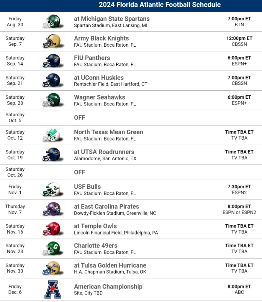 2024 Schedule Thoughts: This is reason #2 for optimism for the Owls. This schedule is one of the easiest in the conference, the Owls face only 2 teams that made a bowl last season. It starts with the non-conference where their biggest test is likely the opener against a rebuilding Michigan State team. They also face FIU in the Shula Bowl and UConn, both of those teams are sorting things out. They also face Wagner a NEC team coming off a 4-7 season so they shouldn’t pose a challenge. I felt like I had deja vu with a FAU vs Wagner game, it turns out that’s because this will be the 3rd time they’ve played since 2012, why does FAU like playing Wagner so often? The conference schedule falls very nice for the Owls, they face UTSA/South Florida from the big 4 and Army is at home. Everyone else is expected to finish toward the bottom half of the conference.