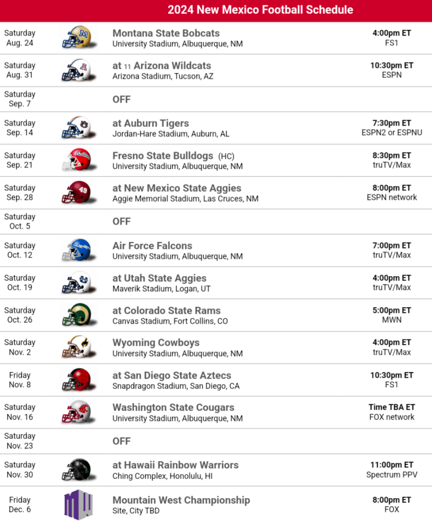 2024 Schedule Thoughts: This schedule is absolutely brutal. The non-conference does them no favors, if you compare to last season they trade Tennessee Tech a 4-7 FCS team a year ago for Montana State who is expected to be a top 4 FCS team and could probably beat half of the FBS teams. They also trade a game at UMass for a game at Auburn. So yes this is going to be difficult. The Montana State game will be a lot of fun in week 0, but New Mexico is over a touchdown underdog in that game and whether they got better against the run or not will be tested immediately against the Bobcats strong running offense. Arizona and Auburn are both rough games. They also essentially lost Nevada on the schedule for Washington State. Everyone they play in conference play is expected to finish higher than them in the standings and the teams ranked closest to them are all on the road. The Lobos could be improved and it might not show.