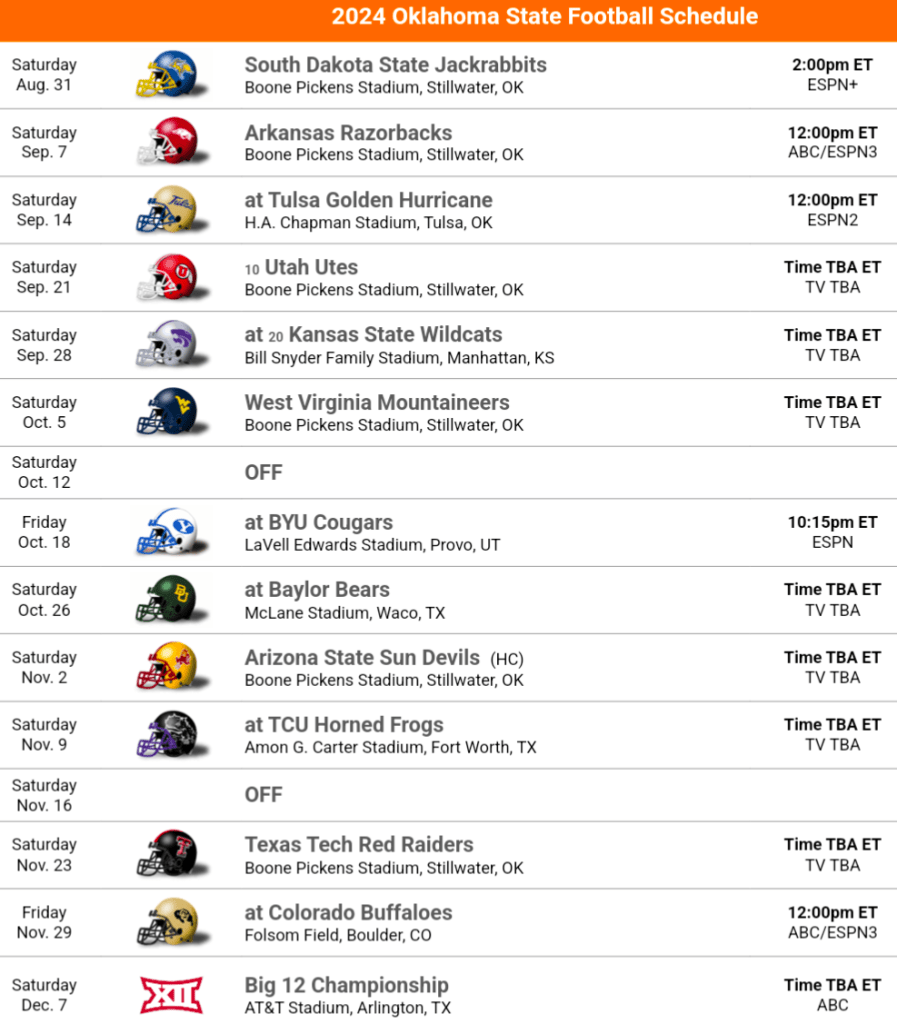 2024 Schedule Thoughts: This schedule has it’s challenges but nothing this roster can’t overcome. The non-conference schedule is a lot of fun. The opener is a real doozy though, it might be a FCS team but this is a powerhouse they’re inviting into Stillwater. South Dakota State has won back to back FCS national titles and most power ratings would have rated them as a Top 25 FBS team the last couple years. The Jackrabbits might seriously be their toughest non-conference opponent. Next Oklahoma State plays Arkansas, fun fact Oklahoma State is closer to Arkansas than any of their SEC mates (the next closest is Oklahoma who Arkansas also doesn’t play) for how regional this game is the programs haven’t met since 1980, glad they’re finally making it happen. Oklahoma State then plays at Tulsa, a type of in-state game that is becoming more rare in today’s landscape so it’s one to embrace, respect to Oklahoma State for scheduling it. It’s trail by fire to open the Big 12 slate, Oklahoma State faces the 2 favorites right off the bat and hosts another contender in West Virginia before going on the road to a challenging unfamiliar environment at BYU. The schedule is expected to ease up after that. The path to the playoff is wide open.