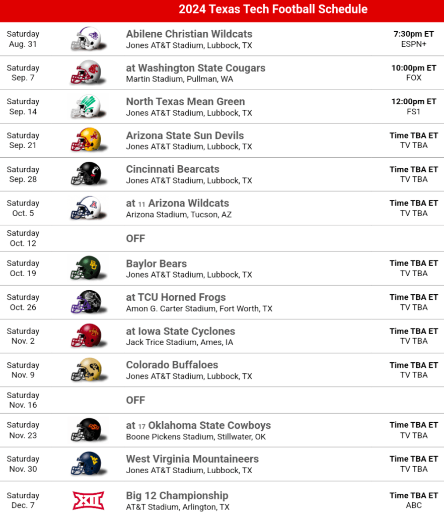 2024 Schedule Thoughts: There’s good news and bad news with this schedule. First, the good news this schedule is easier than their last 2 years. The non-conference features games against Abilene Christian who’s coming off a 5-6 FCS season and shouldn’t threaten, and North Texas who lost a lot of players to the portal. The road game at Washington State won’t be easy but it certainly beats going on the road to face Oregon which was the original game they had. They avoid a lot of major players in the Big 12 they don’t face Utah, Kansas State, Kansas, or UCF. Now here’s the bad news, almost all of their biggest tests are on the road and the road generally hasn’t been friendly to the Red Raiders lately. A winning record should be the minimum but if they can start winning more on the road the Red Raiders can become more of a contender.