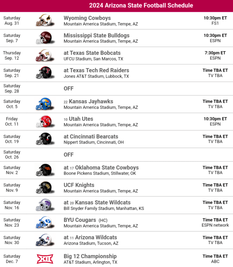 2024 Schedule Thoughts: This isn’t the time to challenge yourselves Arizona State…ugh. They open with Wyoming who is always a tough opponent. The Pokes play good defense and will try to control the clock. Then they play Mississippi State, at least the Bulldogs are trying to figure things out themselves? Texas State is supposed to be really good this year so playing them on the road 5 days later won’t help. The conference schedule is brutal as well they play 7 of the top 9 teams in the preseason Big 12 poll and all of the Top 5 contenders. There’s no clear wins on this schedule and a lot of games where they will be underdogs.