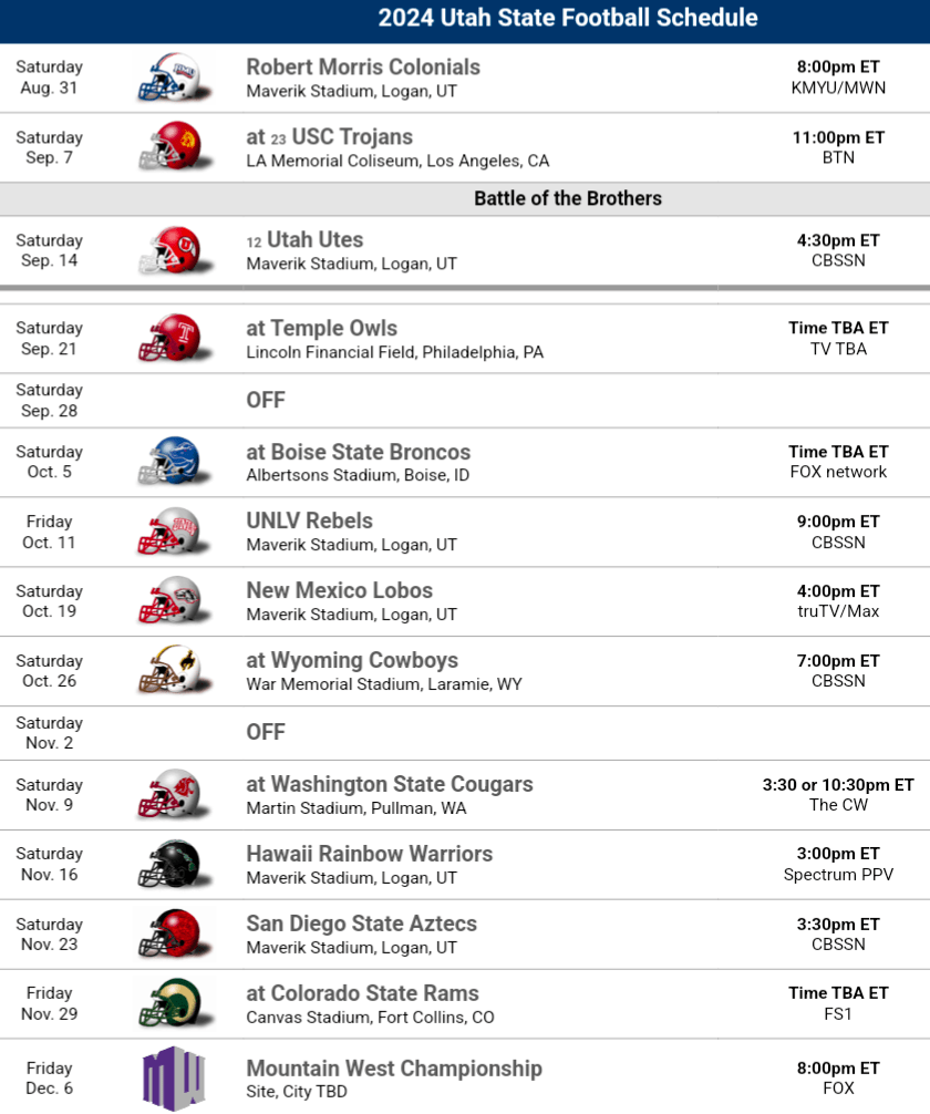 2024 Schedule Thoughts: Utah State has a very tough schedule. The opener against Robert Morris won’t pose much of a challenge but it immediately ramps up with back to back games against USC (in Big Ten Network After Dark!) and a major home opportunity in a renewed rivalry game against Utah. They wrap up the non-conference against a Temple team that is figuring a lot out, but the cross country road trip will be a challenge and Washington State will be a tough challenge as well. The conference schedule is tough, Utah State faces a lot of the top contenders for the conference but they also get a lot of teams that are projected in the bottom half of the conference at home. Salvaging a bowl game out of this season is very possible, getting any further will be difficult.