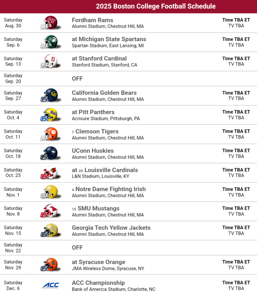 How does the 2025 Roster look?: Boston College ranks 51st in the country returning 58.5% of their production per Punt and Rally’s returning production rankings. Key players starts with WR Lewis Bond, he’s the go-to guy in this offense and one of the better receivers in the ACC. BC also has a game breaker in Reed Harris, he can score from anywhere. BC had 4(!) RBs with over 50 carries last year, it may be less of a committee now with Jordan McDonald and Turbo Richard taking the lead roles. The defense will be led from the backend. The safeties KP Price and Carter Davis are one of the better duos in the ACC, and corner Amari Jackson if he can stay healthy will be a top corner to round it out. Boston College is known for great linebackers and outside backer Davveon Crouch certainly fits the mold. The question marks starts with QB, Grayson James finished out the year as the starter once Bill O’Brien got frustrated with Thomas Castellanos but he was only ok, Alabama transfer Dylan Longeran was brought in to push him or take the job outright, chances are you’ll see both play at some point. Boston College was slowly getting better in the trenches after not recruiting them well enough early under the previous regime, they finally performed well last year but now key players on both the offensive and defensive lines are gone. The offensive line will need some portal guys to make an impact, the DLine will handle the ground game but there’s no telling where the pass rush will come from with Donovan Ezeiruaku off to the NFL.
