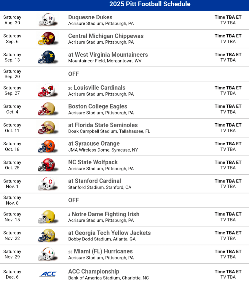 2025 Schedule Thoughts: Pitt has a challenging schedule overall. The Non-conference features Notre Dame and the Backyard Brawl which will carry some extra zest with Rich Rod back at WVU. Pitt also hosts the local Duquesne Dukes, who are one of the best teams in the NEC but Pitt will be a different challenge for them. Central Michigan is a game to be weary of, Matt Drinkall previously Army’s Oline coach took over that program and who knows what offense they will run. In ACC play Pitt avoids Clemson and draws Stanford but plays just about every other team that’s projected to be toward the top of the league standings. Pitt doesn’t travel more than a couple hours away until October 11th but their longer road trips are back loaded on the schedule. Pitt must get off to a fast start to show improvement this year.