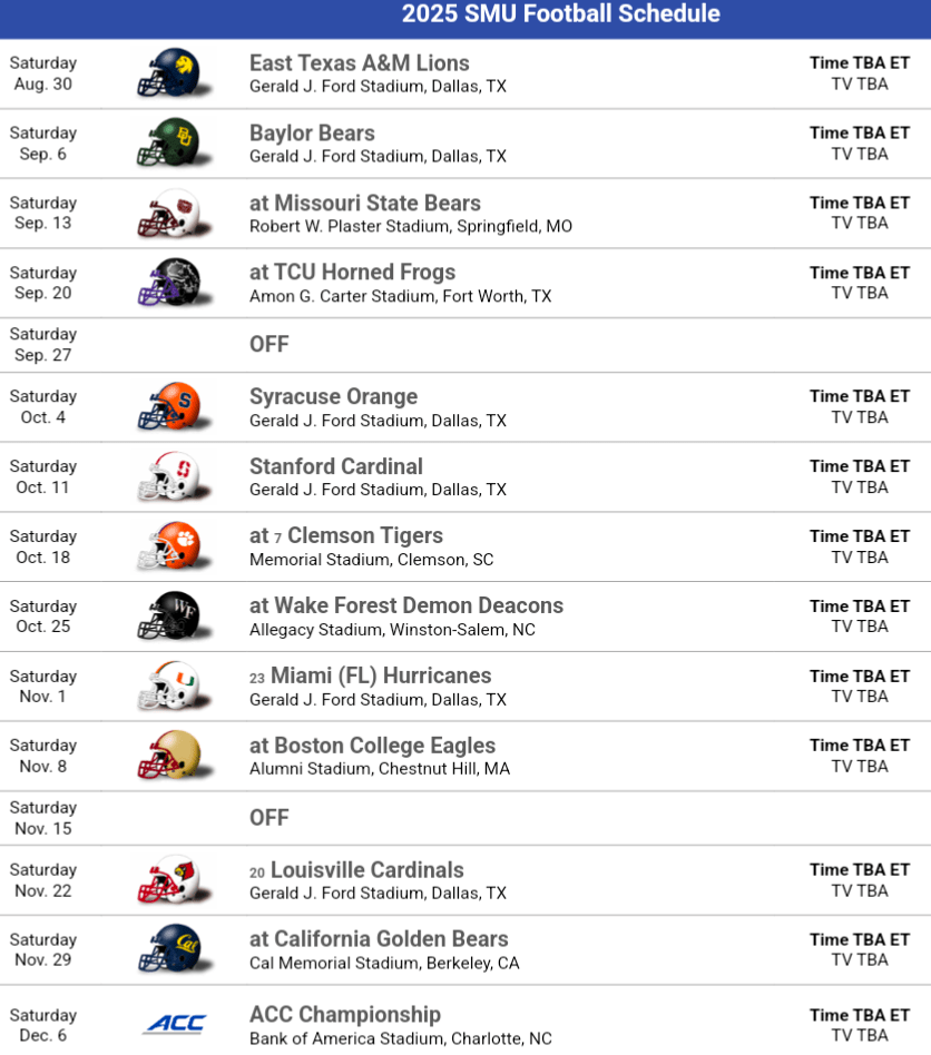 2025 Schedule Thoughts: First, I just have to say that SMU has one of the most awesome non-conference schedules in the entire country. 3 regional games in TCU, Baylor and East Texas A&M, plus a road game at FBS newcomer Missouri State which was very cool of the Mustangs to do. Baylor and TCU are going to be very interesting rivalry games. The ACC schedule is mixed, SMU has tough challenges at Clemson but at home against Miami FL, Louisville and Syracuse. There’s also some nice breaks against teams that are projected toward the bottom of the ACC, but I really don’t like that November road game at BC bad weather potential there. This schedule at a minimum means that SMU definitely won’t go undefeated in conference play in the regular season.