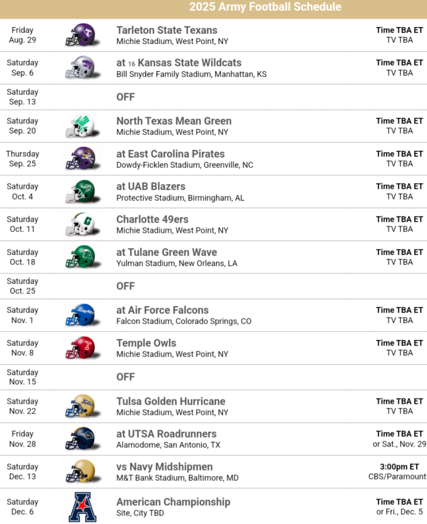 2025 Schedule Thoughts: Army’s schedule isn’t too challenging. Their non-conference schedule never carries much variability with games against Air Force and Navy locked in each season. Tarleton State is their FCS opponent of choice this year, this is a slight changeup as Army usually plays Patriot League teams, Tarleton State is potentially a top 10 team at the FCS level and shouldn’t be taken lightly. Kansas State will replace Notre Dame on the schedule this season, the Wildcats aren’t as tough as Notre Dame but still a big test. Army’s Conference schedule is challenging because their 3 toughest games Tulane, UTSA and ECU are all on the road but there’s also a lot of favorable home games.