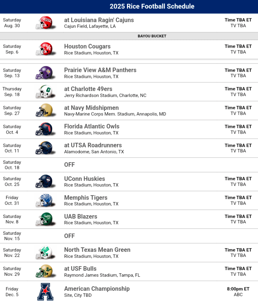 2025 Schedule Thoughts: The schedule is pretty tough for Rice, they didn’t get the best of draws. The non-conference is a lot of fun with the Owls playing Louisiana just down I-10 in the opener, then comes what is unfortunately the last Bayou Bucket game for the foreseeable future hopefully we see it again soon. Rice will also play regional FCS foe Prairie View who is coming off a 5-7 season and the Owls wrap up the non-conference with UConn. The AAC draw is tough with Rice getting 5 of the better teams in the conference, and only facing 3 teams that are in a similar rebuilding position.