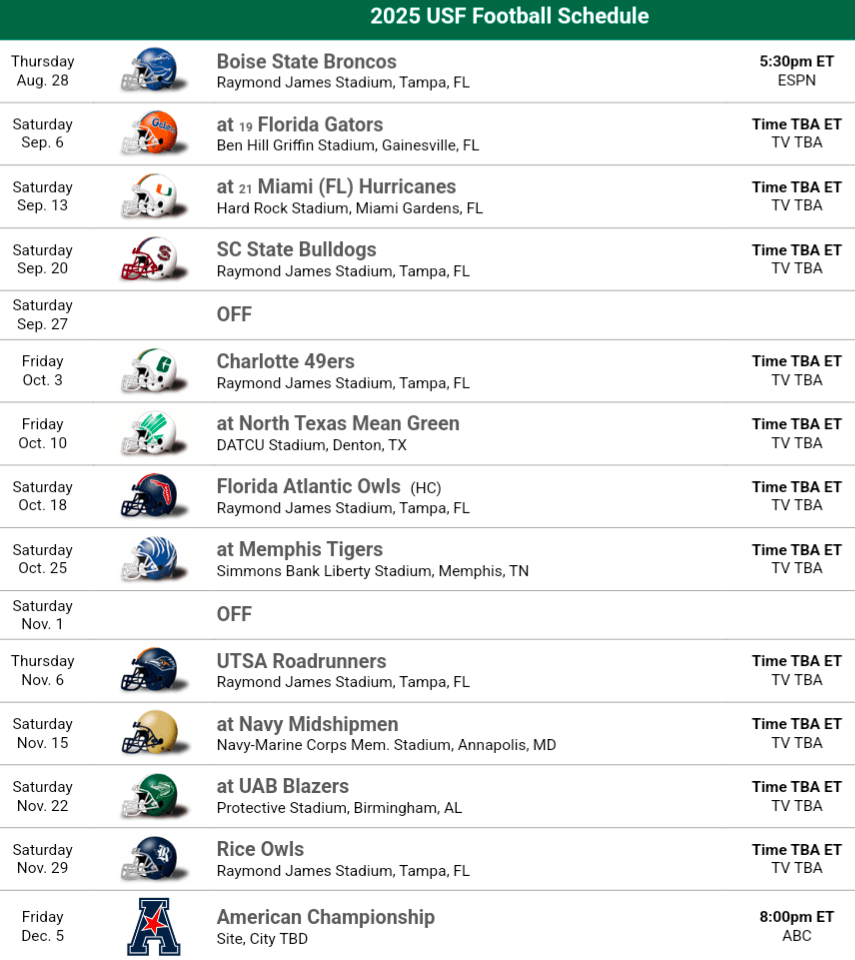 2025 Schedule Thoughts: South Florida plays a really challenging schedule. It starts with the non-conference where they could end up playing 3 Top 15 teams in Boise State, Miami FL and Florida. I really love that trio of games though. Even SC State is good at the FCS level, they ran through the MEAC last year and might be a top 25 FCS team. The AAC did a good job trying to balance schedules, USF is another team with a perfect split between teams at the top and bottom of the conference. The challenge is that USF has to play 3 of the contenders on the road. If Brown stays healthy, I’m optimistic that USF can improve on their record from the last 2 years. The schedule may prevent a playoff run in the end.