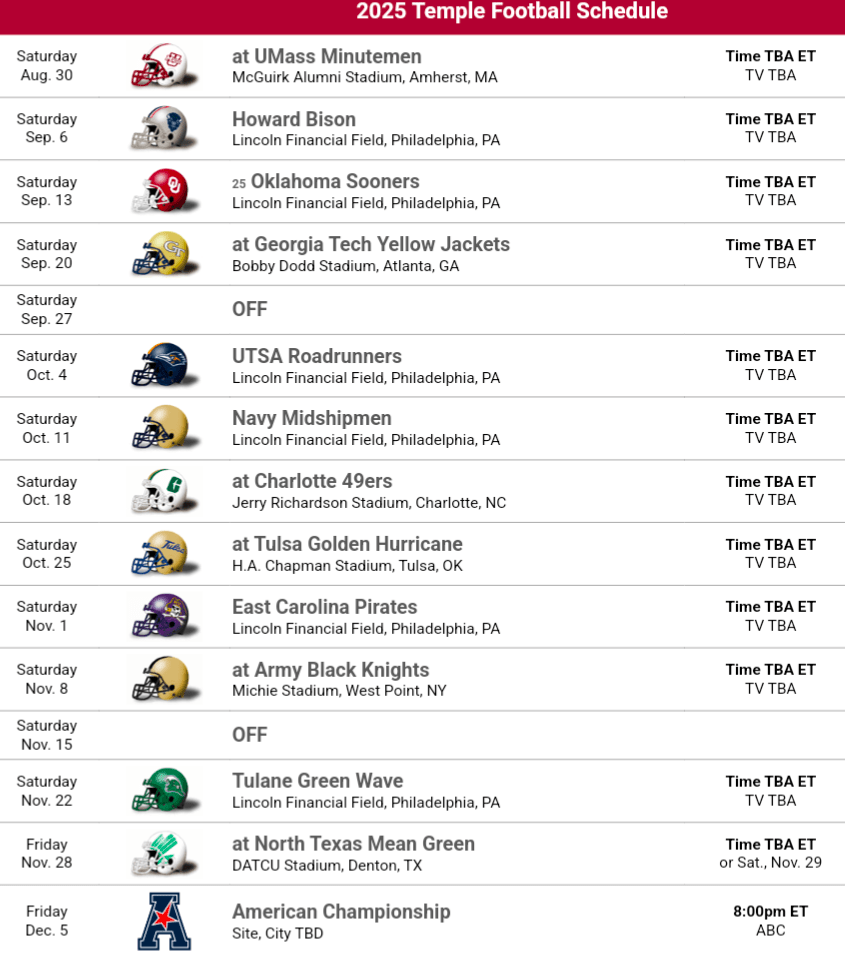 2025 Schedule Thoughts: Temple’s schedule is really difficult. Their best opportunity for momentum is early, they get a tone setting game to open against UMass and then they face Howard who struggled to a 4-8 record last season. Temple finishes out the non-conference with an extremely random home game against Oklahoma and a road game against Georgia Tech. Temple’s AAC schedule is rough, while most teams happened to draw a good balance, Temple faces 6 of the better teams in the conference and only 2 teams that are in similar rebuilds. Making matters worse, Temple plays both of those winnable games on the road! Temple might have a better team this season but this schedule could result in the record not showing it.