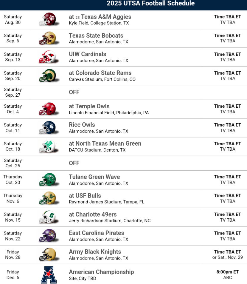 2025 Schedule Thoughts: UTSA’s schedule is a good mix of challenging and winnable. They have an extremely fun non-conference schedule. UTSA faces in-state foe Texas A&M, and then the I-35 Rivalry against Texas State in a critical game for both teams. UTSA plays an awesome in-city FCS foe when they face Incarnate Word, fun fact Incarnate Word is actually closer to the Alamodome than UTSA is. The Roadrunners can’t overlook UIW, they are projected to be top 10 FCS team despite losing their OC and some key players in recent months. The non-conference schedule wraps up with a test at Colorado State. UTSA’s AAC schedule includes 5 games against fellow contenders and 3 rebuilding programs. Perhaps most importantly UTSA gets Tulane and Army at home.