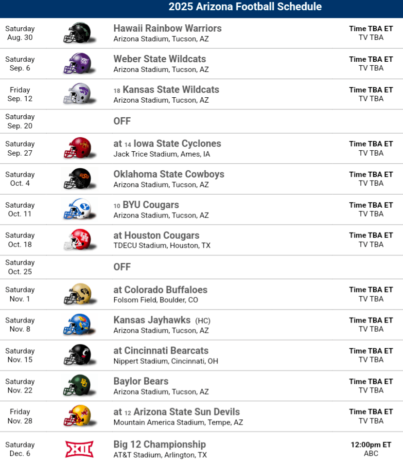 2025 Schedule Thoughts: The Big 12 often goes in unpredictable ways but I feel safe saying that Arizona’s schedule is not favorable. The Wildcats open non-conference play with manageable games, Hawaii had a disappointing season last year but returns a lot of production and Weber State was disappointing at the FCS level going 4-8 last year. Arizona and Kansas State had a series scheduled when the Big 12 move happened so as a result, Arizona essentially plays 10 conference games. They currently appear to have drawn a lot of the toughest teams in the Big 12 or teams that also seem poised for improvement. This schedule is likely to make getting more wins difficult.