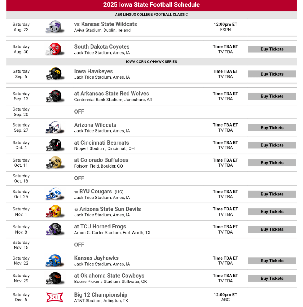 2025 Schedule Thoughts: Iowa State has some challenges but this schedule isn’t too bad. The non-conference will provide some challenges too, they have South Dakota as their FCS foe the Coyotes are on of the best teams in FCS this year so Iowa State must be ready. Then comes the Cy-Hawk trophy game against Iowa, it’s at home but Iowa State hasn’t beaten the Hawkeyes in Ames since 2011. Finally, they wrap up the non-conference with a road game at Arkansas State which is really cool but also provides a test. The conference slate starts week 0 with Farmaggedon in Ireland, it will be very funny when this name is used because Farmaggedon is also the name of a big haunted house in the UK so there may be some confusion! This game provides Iowa State with 3 bye weeks but also an earlier start to the year. In Big 12 play they avoid some contenders like Baylor and Texas Tech but must play a lot of the others. The nicest advantage they have is they get both BYU and Arizona State at home, the BYU game is one of the largest rest advantages you’ll see, Iowa State will be coming off a bye while BYU will be coming off an emotional physical Holy War game. If Iowa State is ready to make a run at the College Football Playoff, this schedule does not get in the way of that.