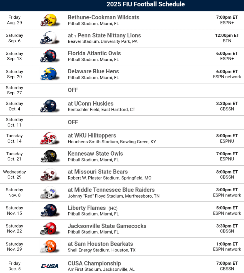 2025 Schedule Thoughts: FIU’s schedule is ok, it’s not the easiest but definitely has some challenges to it. Their non-conference can’t begin more differently they open with Bethune-Cookman who is a mess of a football program coming off a 2-10 FCS season and they immediately follow that up with Penn State, a team many think can win the National Title. It levels off after that, FIU hosts FAU in the Shula Bowl, the Owls also have a new head coach and they wrap up the non-conference with UConn who won 9 games last year. The CUSA schedule includes games against the newer teams (Delaware, Missouri State & Kennesaw State) but also features games against potentially the top 5 teams in the conference. It will require a lot of improvement for a bowl bid.