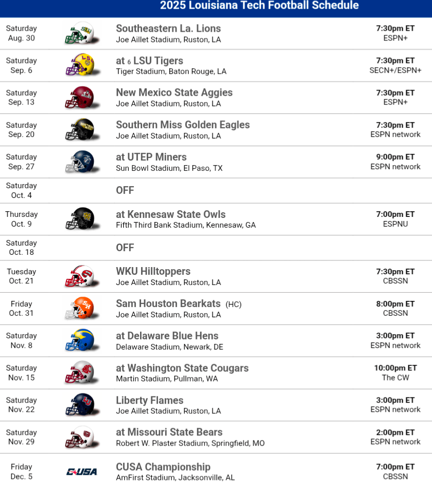 2025 Schedule Thoughts: Louisiana Tech’s schedule is pretty favorable overall. The Bulldogs non-conference schedule is filled with regional foes as they play LSU, Southern Miss and Southeastern who is likely to be one of the better teams in the Southland. Of course, there had to be a random game to fill out the non-conference schedule and that is a mid-November road game to Pullman, Washington to face Washington State! The conference schedule is not bad, Louisiana Tech gets all of the relative newcomers in Delaware, Missouri State and Kennesaw State. They avoid Jax State but do have to play Liberty and Western Kentucky. Overall the schedule allows for more wins.