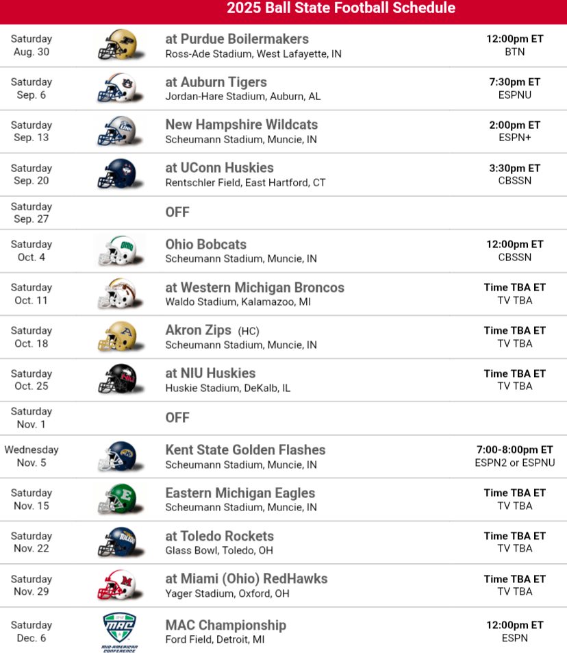2025 Schedule Thoughts: Ball State’s schedule is not favorable for them this year. The non-conference is tough with games against Auburn, UConn and an in-state battle with a Purdue team that will likely be better. Even New Hampshire their FCS foe isn’t a gimmie game, they could once again contend for a spot in the playoffs. The MAC schedule isn’t too helpful either, Ball State gets Kent State and Akron but everyone else on their schedule is at least contending for a bowl this year. There’s 4 other MAC programs with a 1st year head coach but Ball State only plays 1 of them. This schedule will make it difficult to find wins.