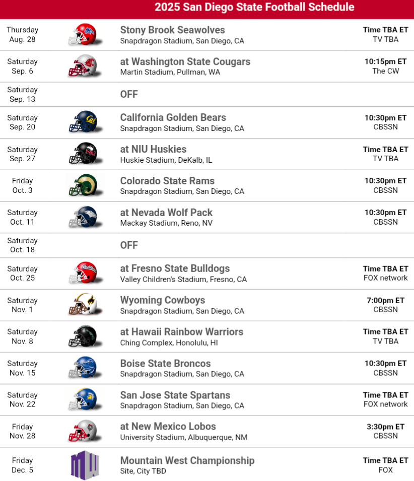 2025 Schedule Thoughts: Here’s the challenge the schedule for San Diego State is pretty tough. They open with Stony Brook and that game is no guarantee after the SeaWolves finished last year strong. The Aztecs also have tough non-conference games against Washington State, Cal and NIU. The good news? The Mountain West schedule is pretty nice. The Aztecs face a lot of programs who are in a similar building position to them. They avoid UNLV, Air Force and Utah State which is pretty preferable. Overall if San Diego State misses a bowl, the tough non-conference schedule will be to blame.
