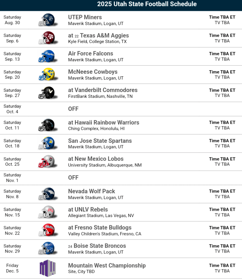 2025 Schedule Thoughts: Utah State faces a pretty challenging schedule. The non-conference includes road games at Texas A&M and Vanderbilt, plus a home game against a UTEP team that looks to be improved. McNeese is their FCS opponent, they didn’t reach the playoffs but could still be tough. The Mountain West schedule has its challenges, Utah State has a mix of games. They didn’t miss any of the top contenders but they also get a lot of the teams who are in the midst of big rebuilds. It makes reaching a bowl pretty difficult.