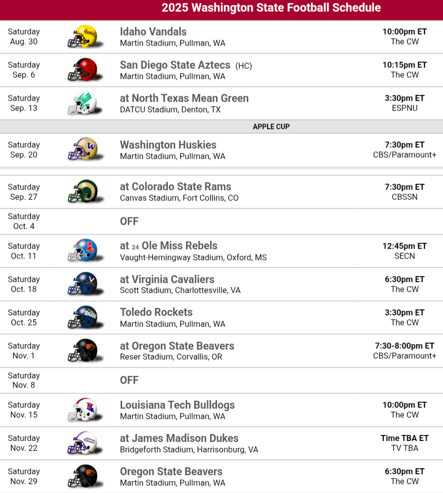 2025 Schedule Thoughts: Washington State put together a very fun and challenging schedule. They have their conference schedule against Oregon State and Oregon State, along with soon to be conference games against San Diego State and Colorado State. They have fun road games at Virginia, North Texas and James Madison along with a challenging one at Ole Miss. It’s also great to see Toledo on there. They have historical rivalries with the Apple Cup and Idaho at home, Washington is of course a big one but Idaho has been a top 8 FCS program lately and can’t be taken lightly either (though I suspect the staff is well aware of that).