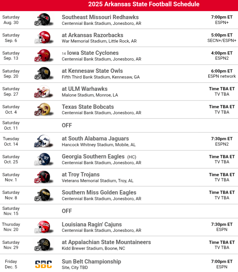 How does the 2025 Roster look?: Arkansas State ranks 106th in the country returning 43% of their production per Punt and Rally’s returning production rankings. Key players absolutely has to start with a dynamic QB-WR duo in QB Jalen Raynor and WR Corey Rucker. Raynor can run and he could become one of the Sun Belt’s best passers if he can cut down on the picks. Rucker meanwhile is one of the best receivers in the conference. The portal will help add some options JJ Harrell (Mississippi State) and Juco transfer Demarco Blanton are among the interesting options added to the mix. Ja’Quez Cross is a very solid back to have as well. The remainder of the roster is full of question marks. The offensive line is mostly new, the good news is that it is larger which should help the run game more but they need to help in pass protection as well. The defense is why Arkansas State is so low in returning production. This whole unit is mostly going to be made of transfers. Bryan Whitehead is one of the few returnees on the defensive line and in general was one of the few pass rushing threats last year. They badly needed bigger men on the interior Dline after being pushed around by ground attacks for years, the hope is that 310lb McNeese transfer Simeon Mitchell can accomplish that and the other DT Cody Sigler (West Alabama) exploded as an interior pass rusher at a lower level last year. Michigan State transfer Aaron Alexander is the closest to a sure thing at LB. The secondary will be led by Marshall transfer safety AG McGhee who was a good pickup and corner Avante Dickerson was solid at Utah State last year.