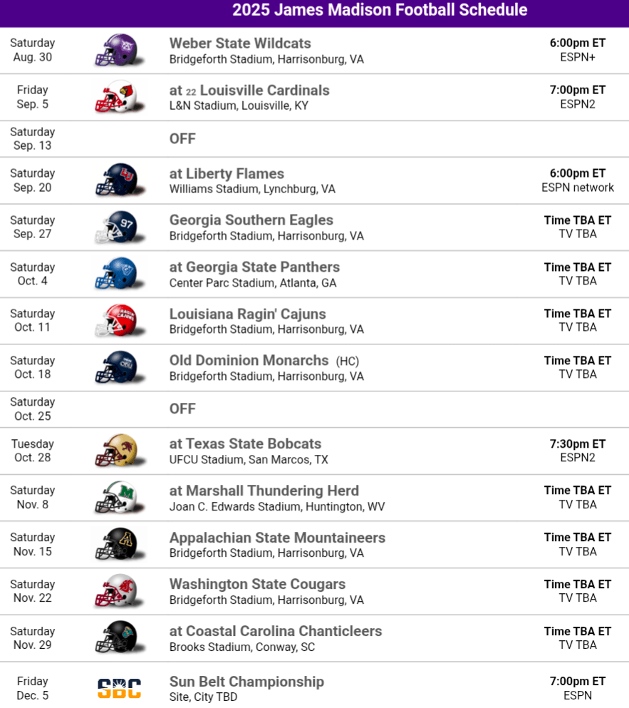 2025 Schedule Thoughts: James Madison has faces a pretty tough and interesting schedule. The non-conference includes a massive show down at Louisville, and an awesome home game against Washington State late in the year, but maybe the headliner is the game at Liberty, it’s been mostly off the field so far but this heated Rivalry takes the field this fall. JMU opens with Weber State who is coming off a down year, and this is only their 2nd meeting that’s not in the FCS playoffs. The Dukes get a tough draw from the West facing the two teams with the highest upside in Louisiana and Texas State, this is somehow JMU’s first game against Louisiana. If the Dukes only lose 1 game they earned a playoff spot against this schedule.